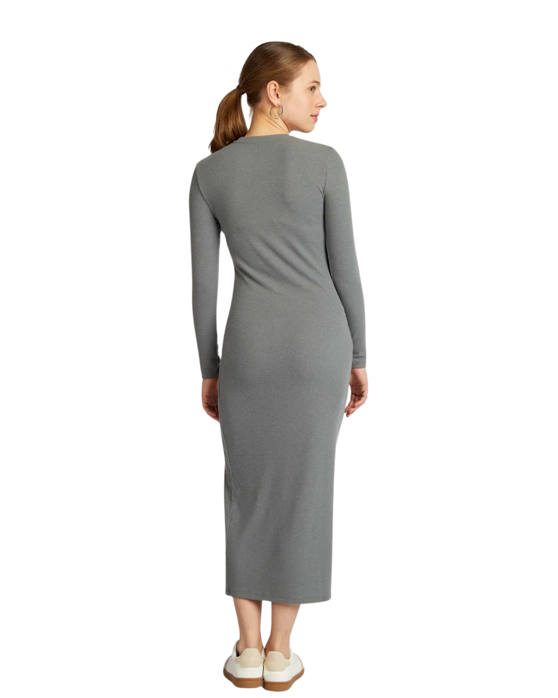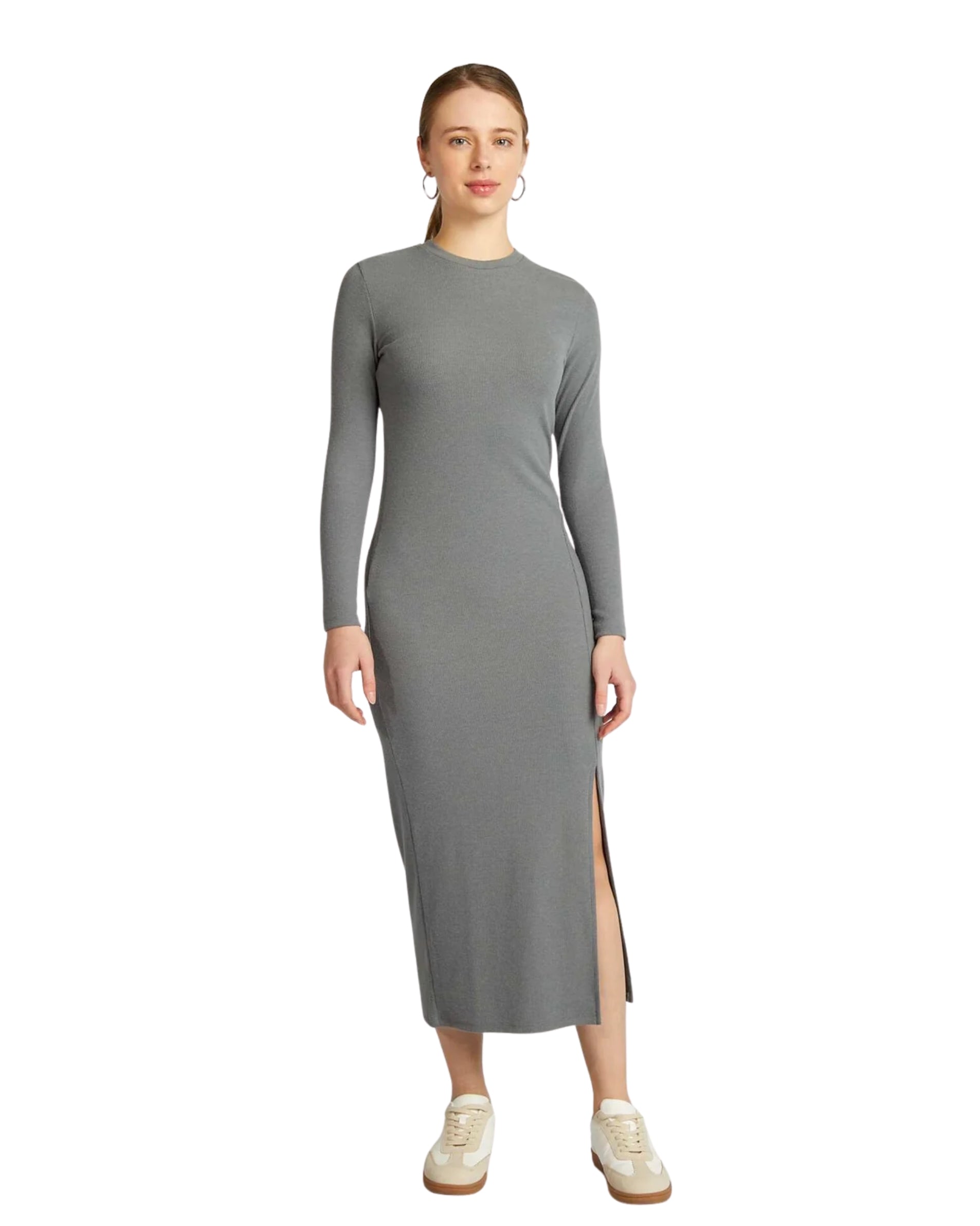Women, Dress, Long Sleeve, Ribbed Knit Long Dress, Round Neck, Midi Length, Small Slit at The Side