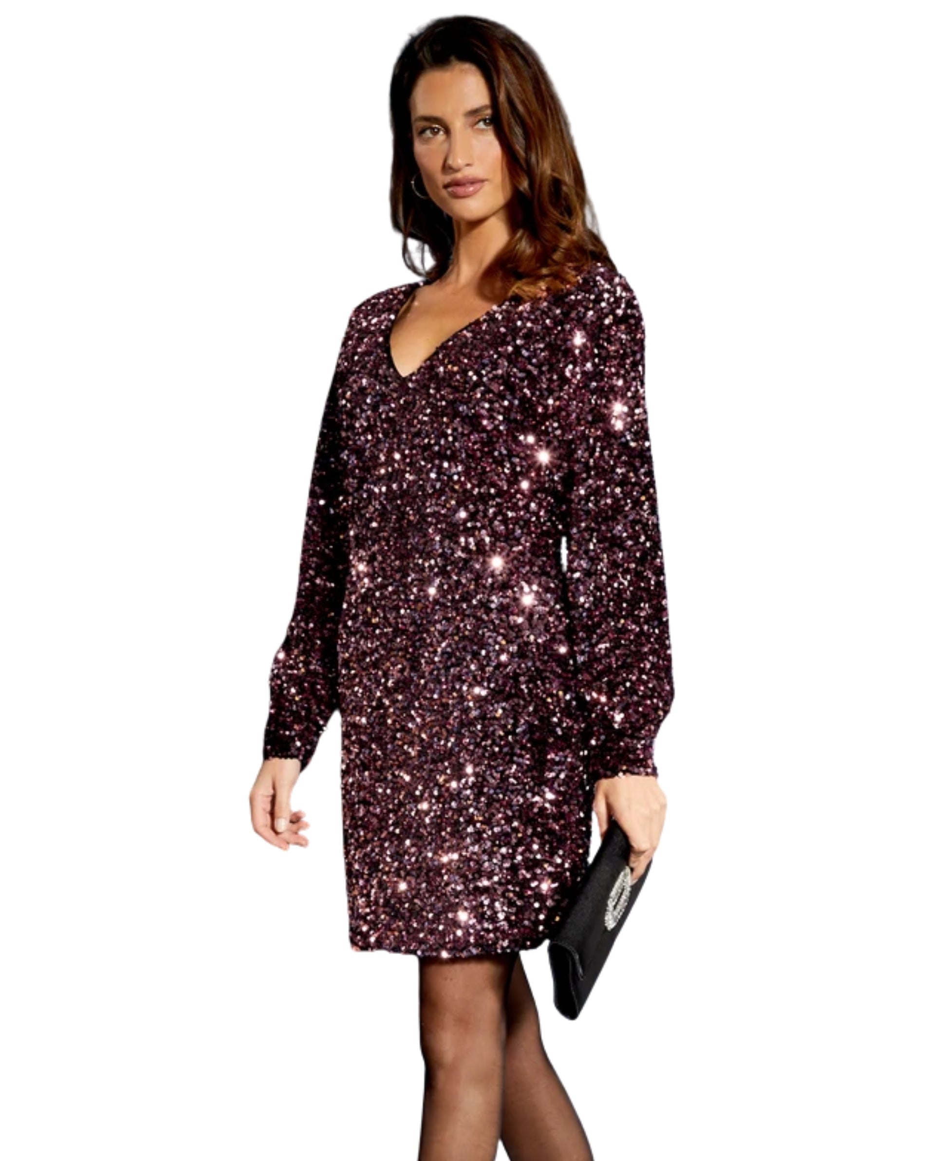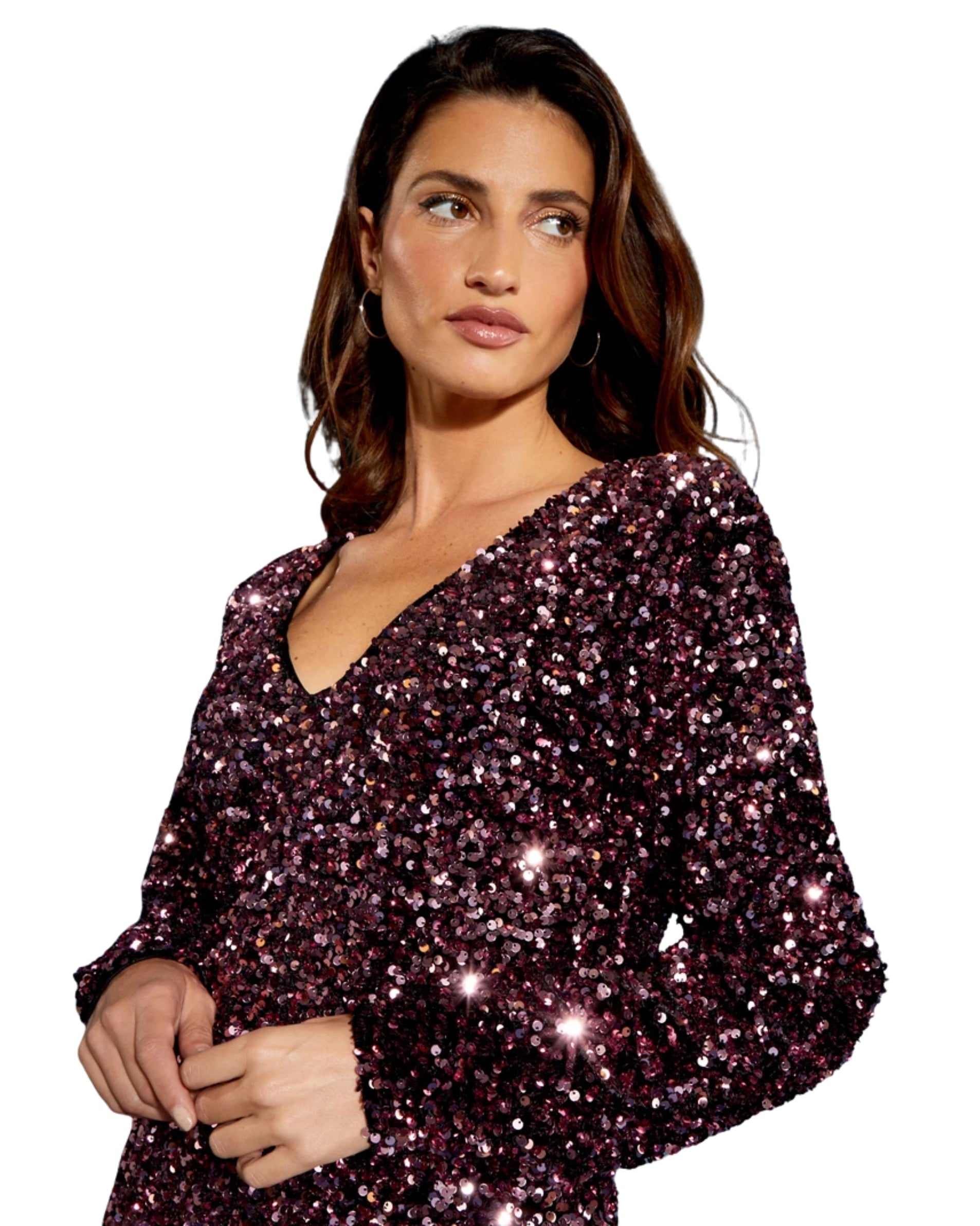 Women, Long Sleeve, Deep V Neck, Back Button, Sequin, Shimmer, Fashion, 96% Polyester, 4% Elastane