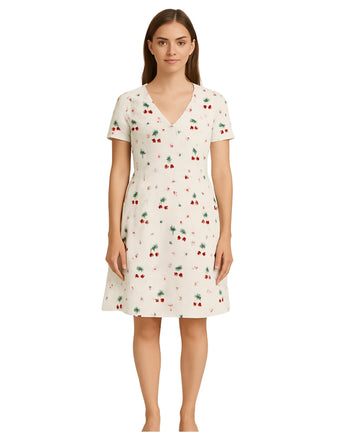 Women, Short Sleeve, V Neck, Button Closure, Allover Cherry Design, Soft, Fit, Casual, 100% Cotton