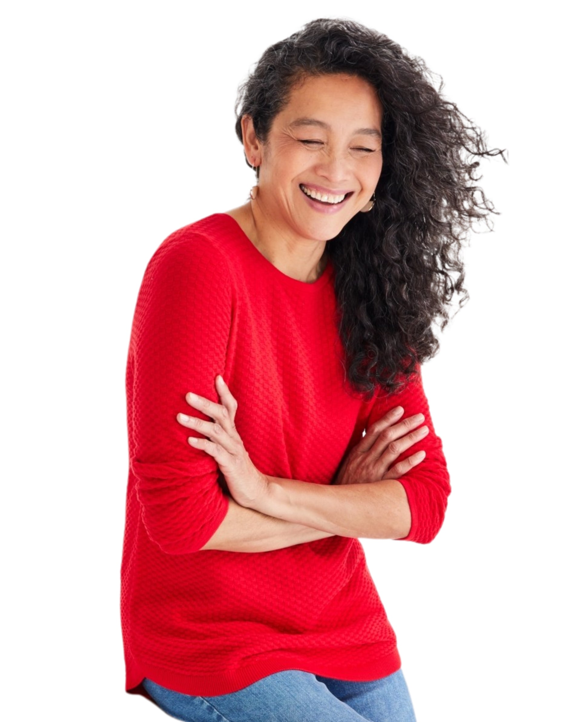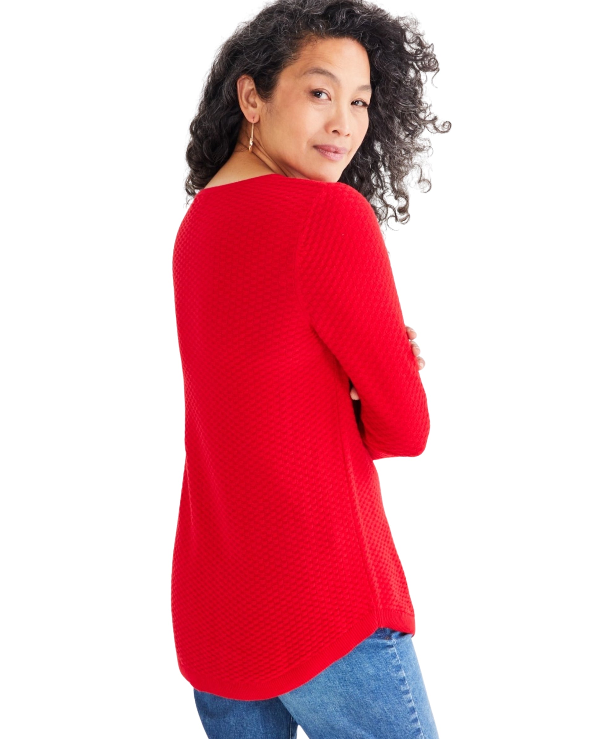 Women, Long Sleeve, Round Neck, Curved Hem & Basketweave Patterned Knit, Stitch, Basic & Casual, 100% Cotton