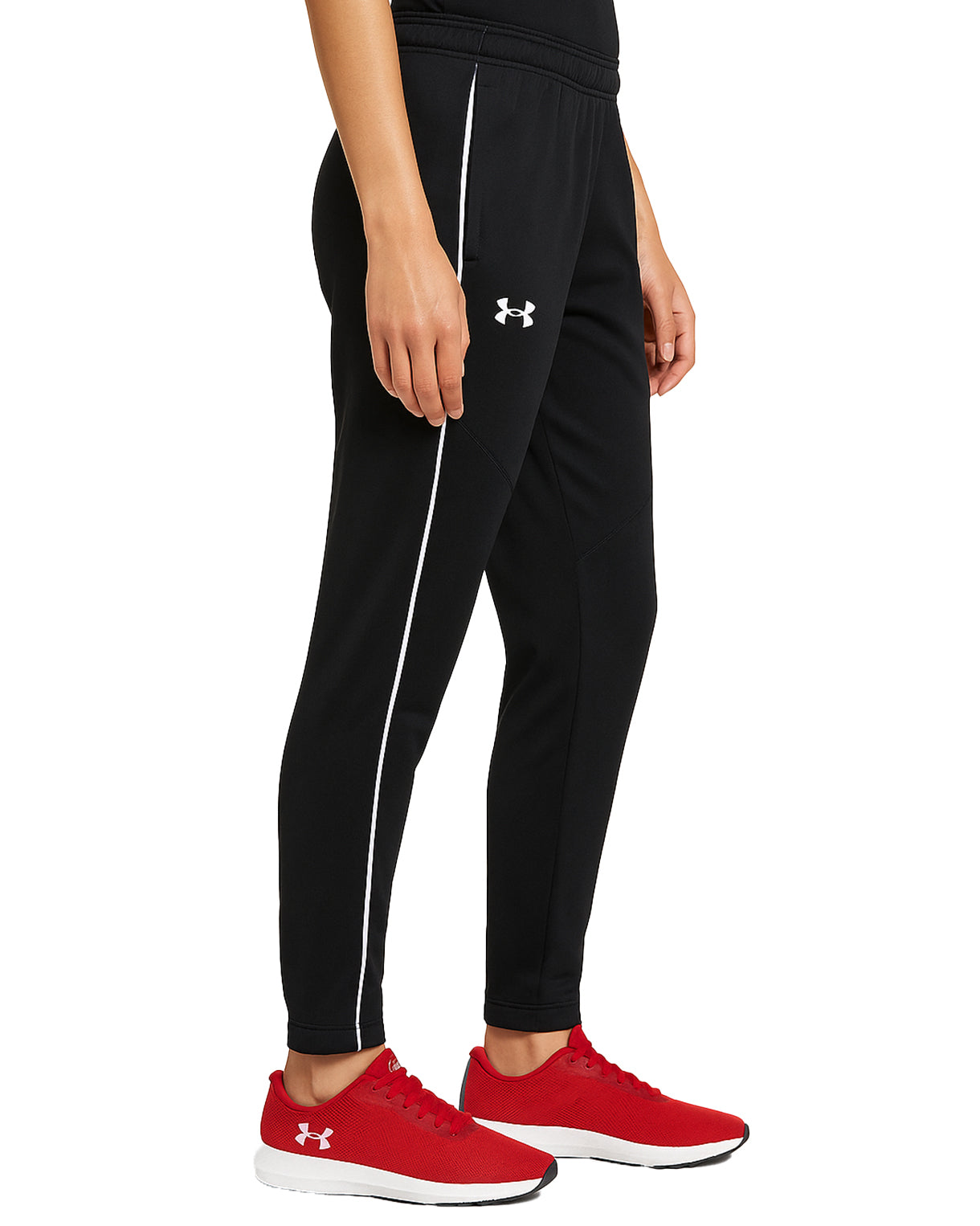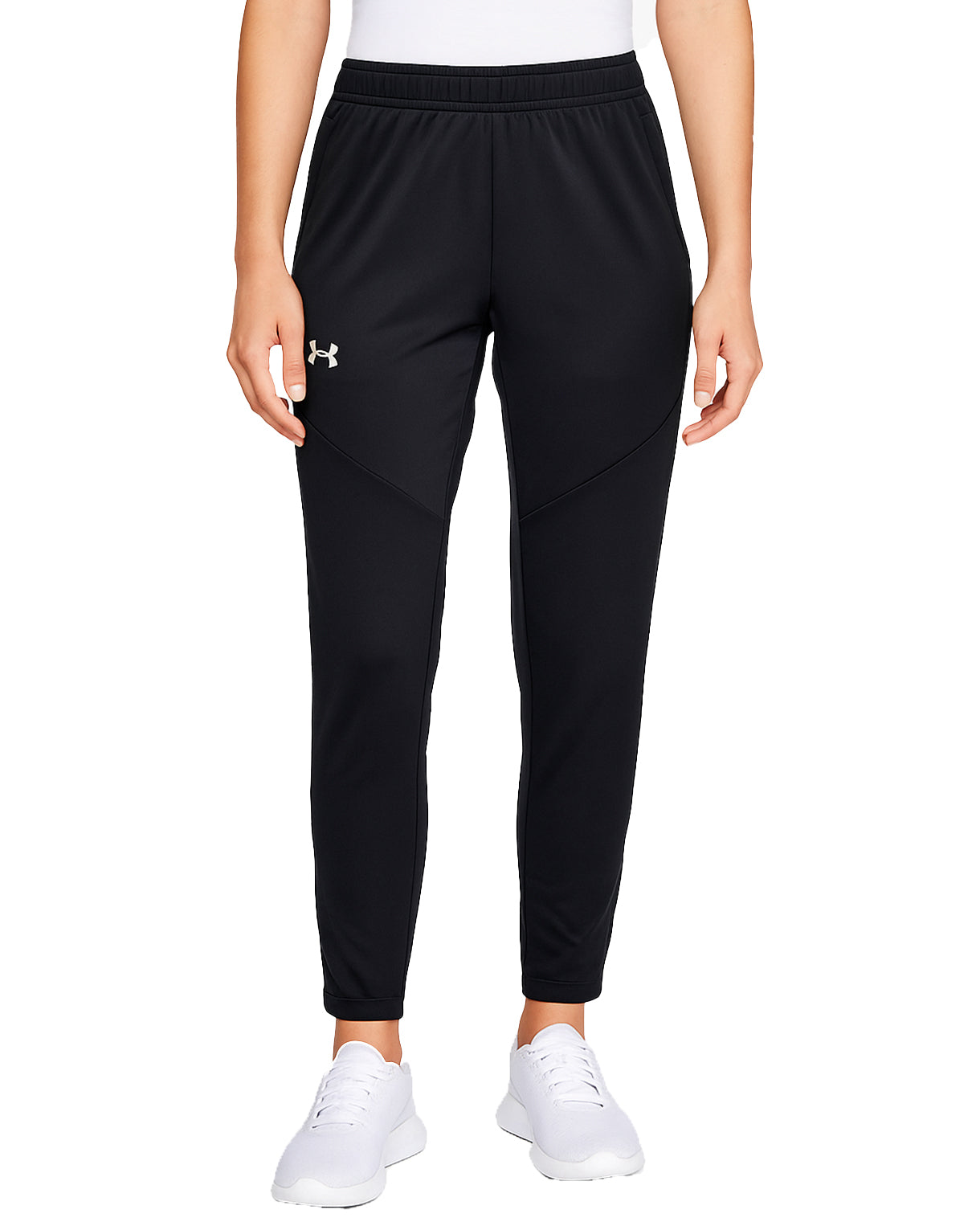 UNDER ARMOUR Women's Logo Pants. These black tapered joggers feature a sleek fit, elastic waistband, moisture-wicking fabric, and signature UA logo—perfect for workouts, running, or casual everyday wear with sporty style and comfort.