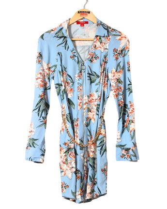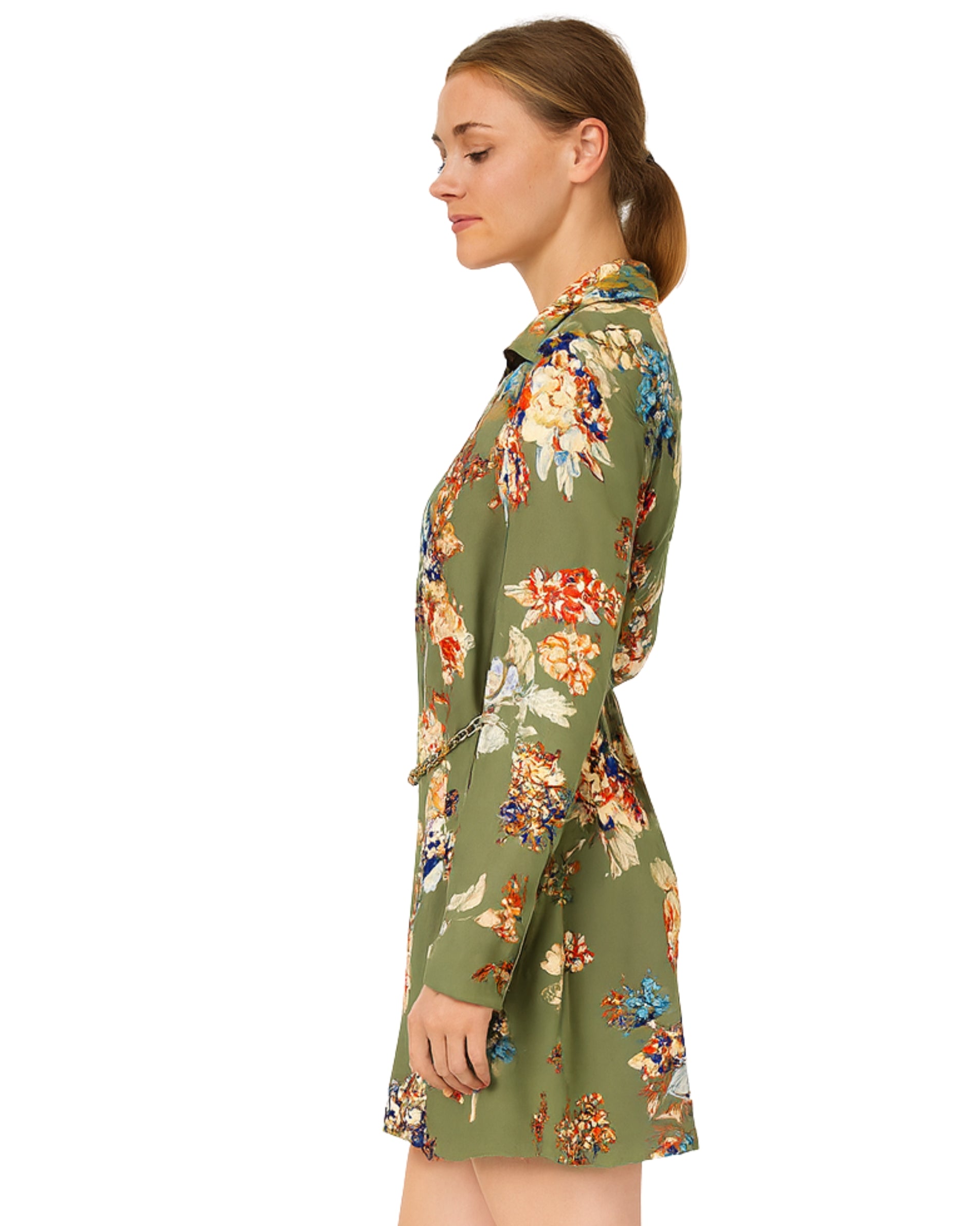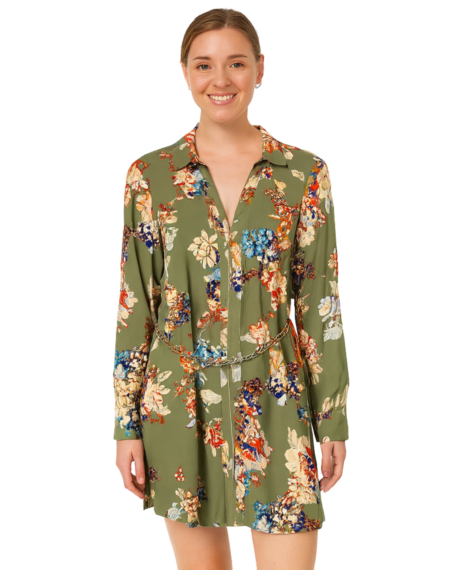 Long Sleeve, Polo, V Neck, Zipper Closure, 2 Side Pockets, Floral, Belt Included, Midi Dress