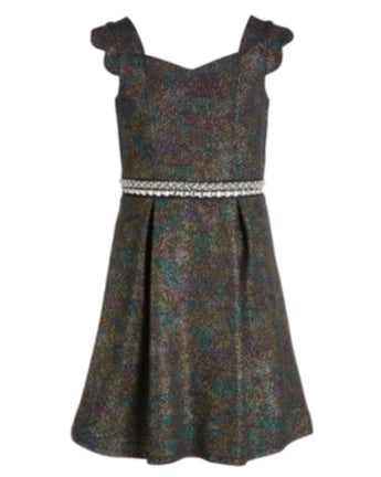 A Line Silhouette, Sweetheart Neckline, Pullover Styling, Allover Rainbow Metallic Detail, Embellished At Waistline