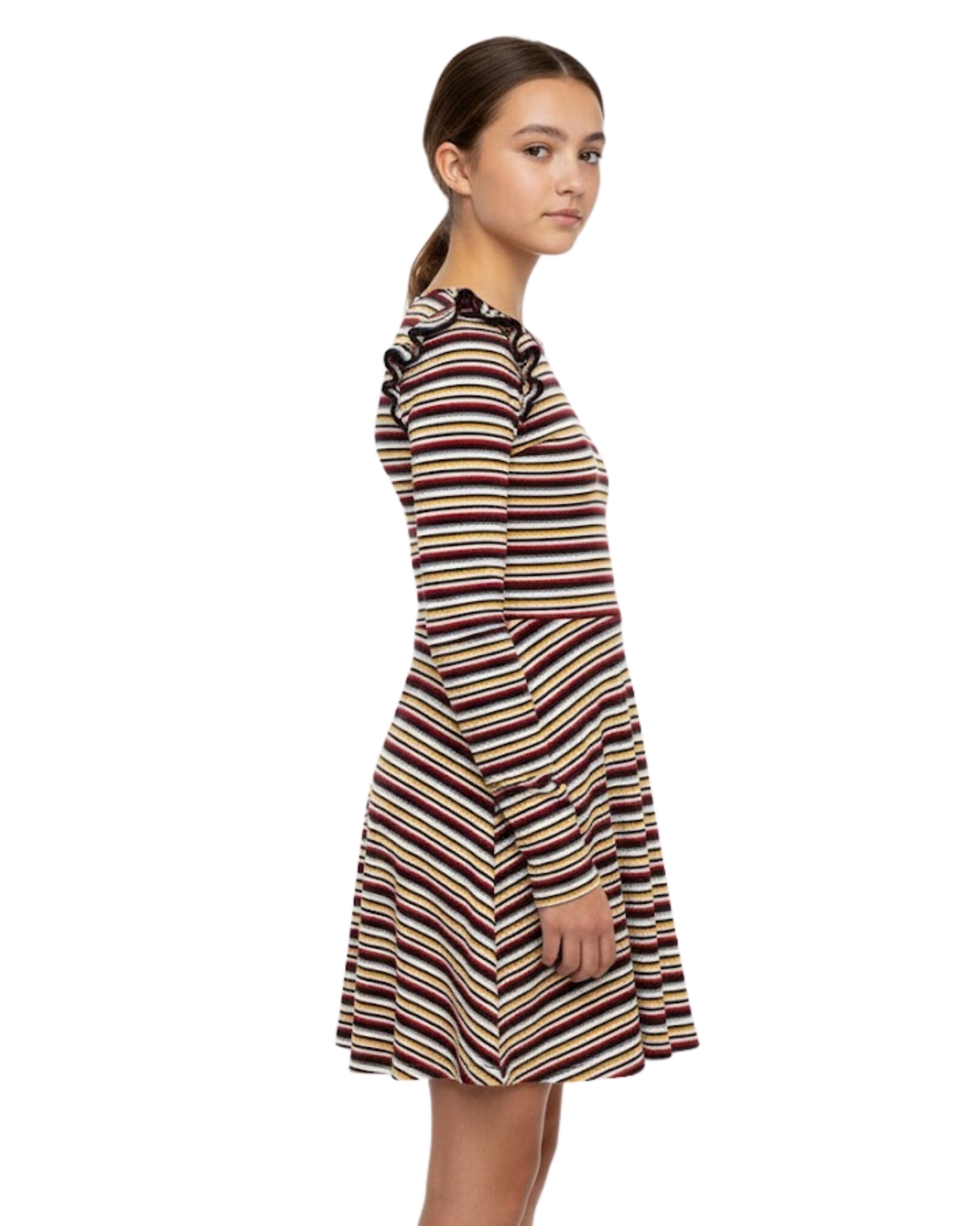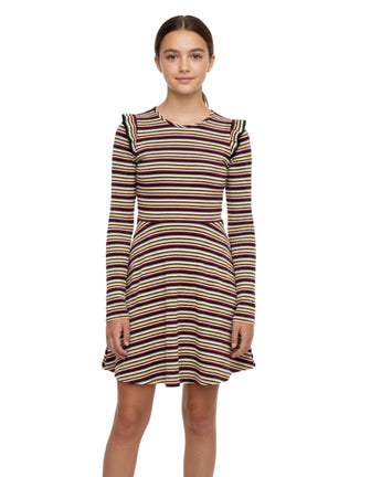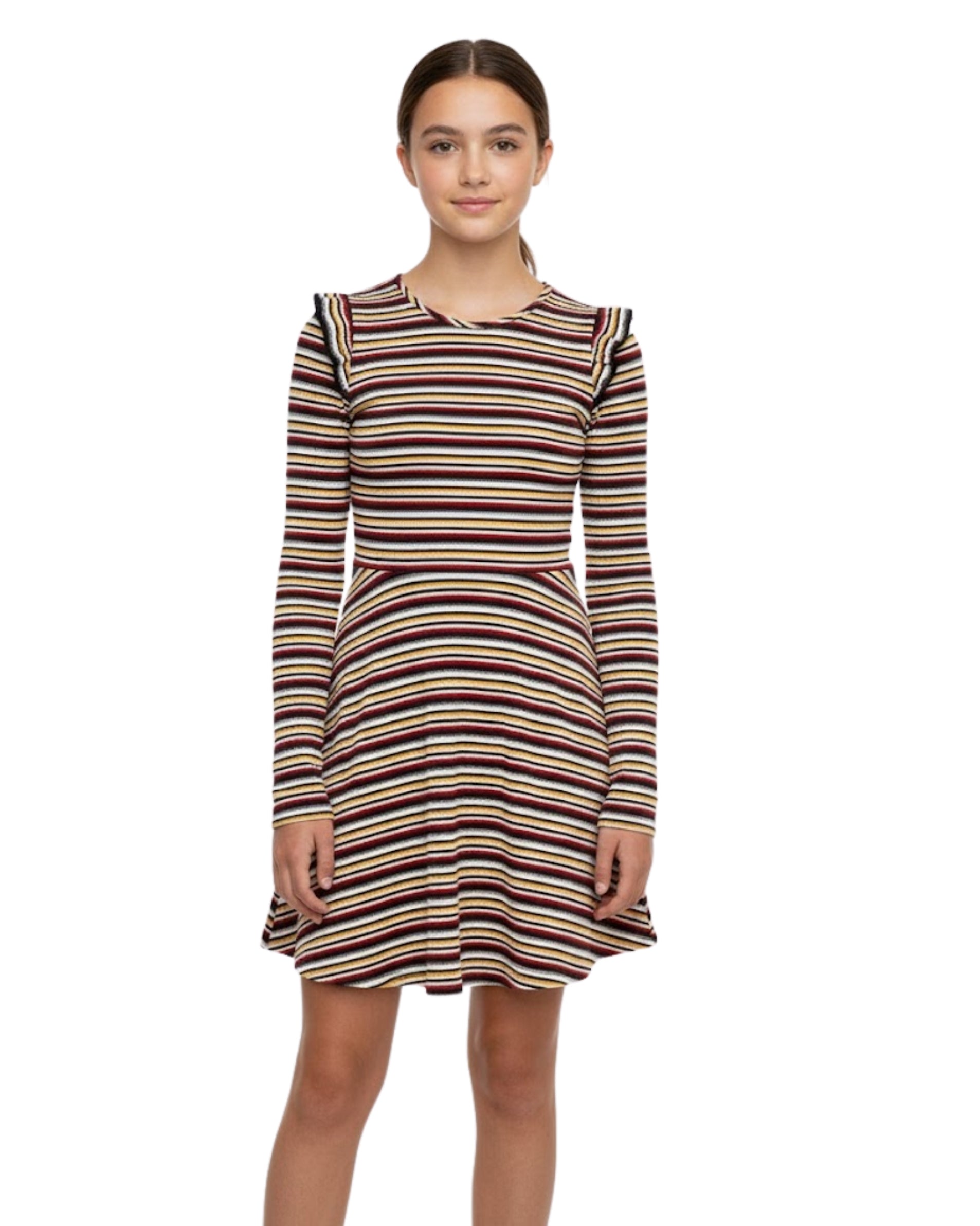 Girls, Long Sleeve, Crew Neck, Back Bow, Stripe, Ribbed, Ruffle, Casual, 49% Polyester, 45% Rayon, 6% Spandex